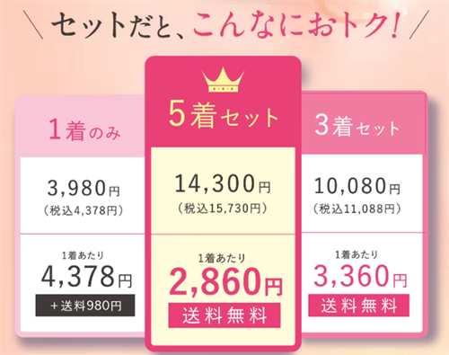 5着セットは税込15,730円で、1着あたりの価格は2,860円と、最もお得な価格設定になっています。